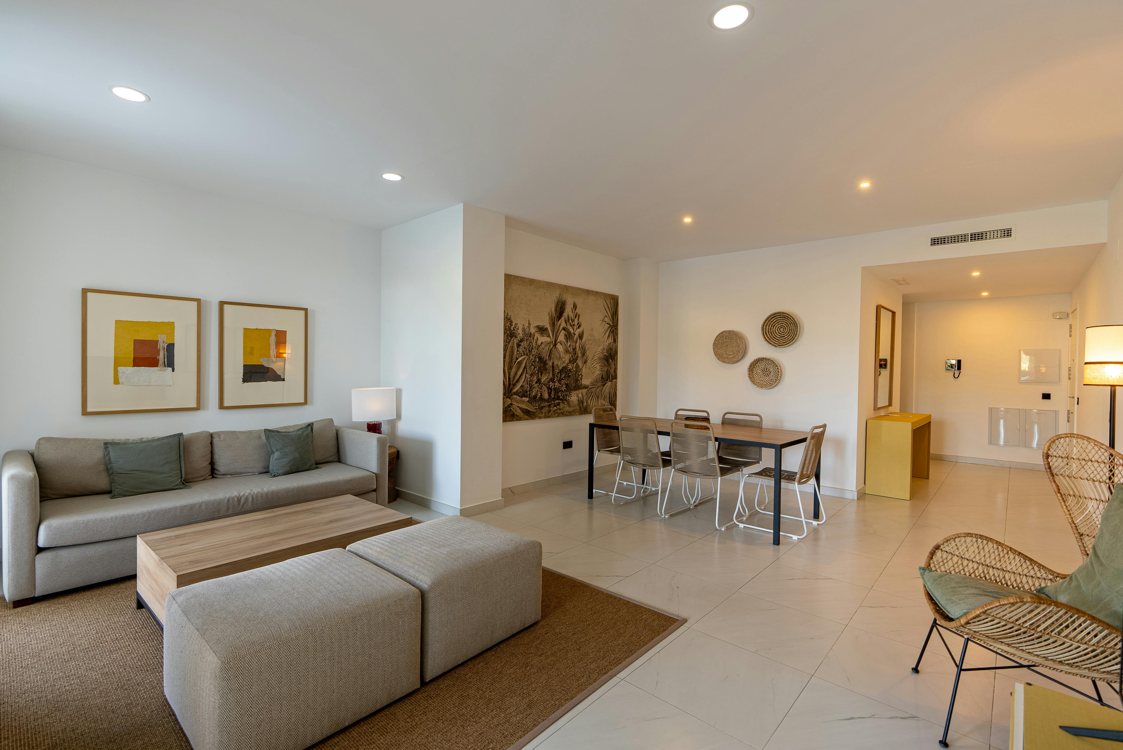 Our Superior 2-bedroom apartments are located on the ground floor and feature a spacious garden. These apartments are between 95 and 125m2; with two bedrooms, one with double bed and other one with two single beds; 2 bathrooms (one of them in-suite); an equipped kitchen; a living-dining room and a large terrace; everything you need to enjoy your stay. All apartments have a hairdryer, washing machine and iron. Each apartment has its own character with different decoration.
